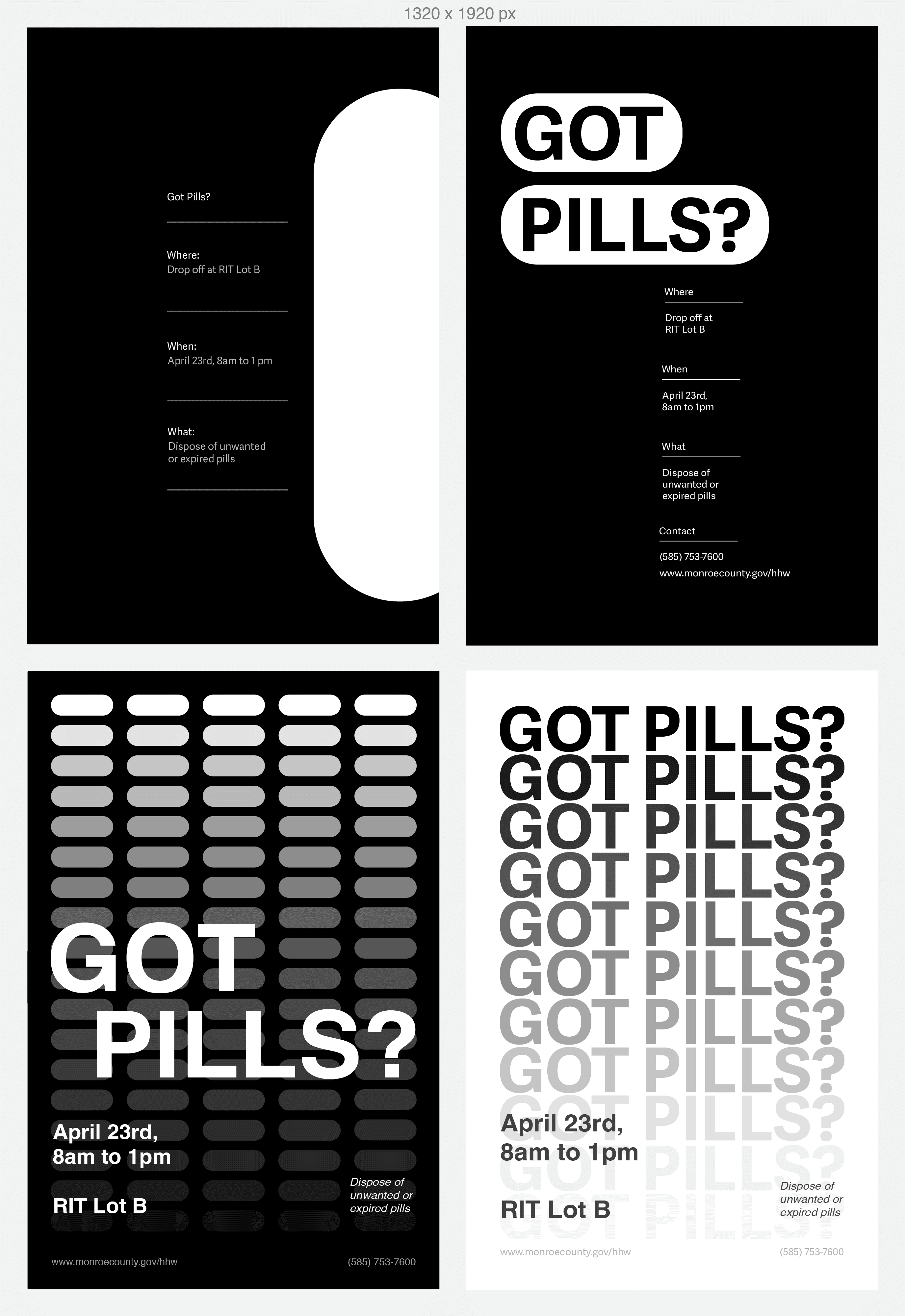 GOT PILLS? was a project focused on exploring composition and typographic hierarchy to create a visually engaging and effective poster. The goal was to design a piece that could function in a real world context, emphasizing clarity of message, strong visual structure, and impactful design choices.
