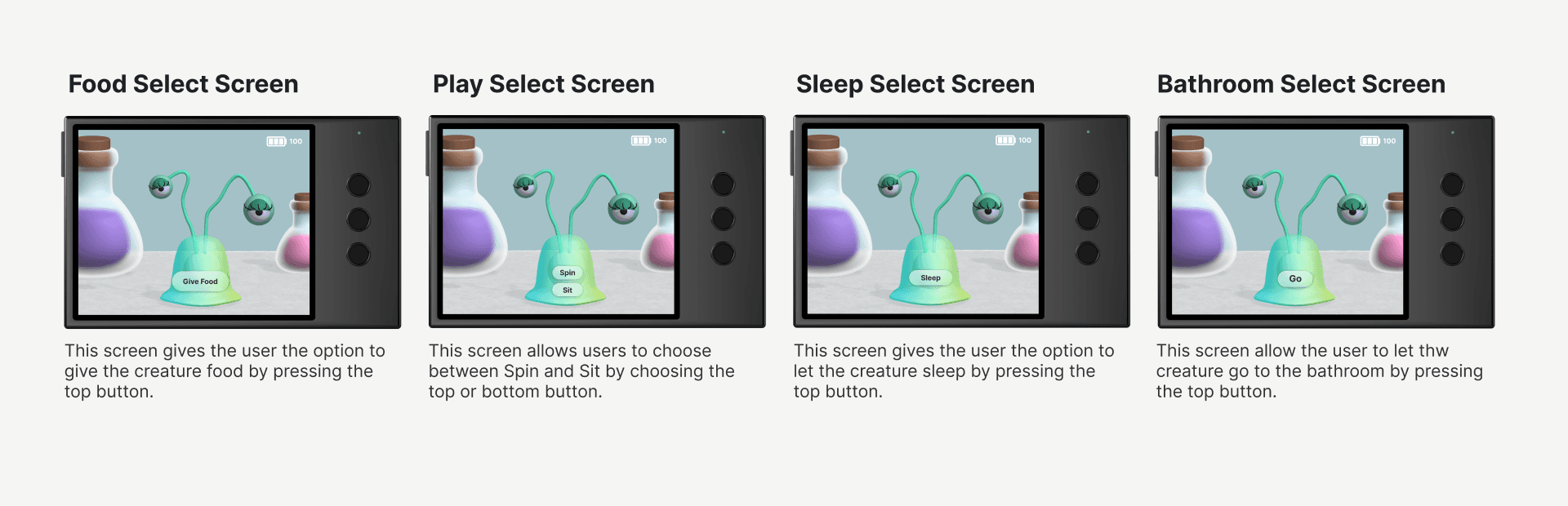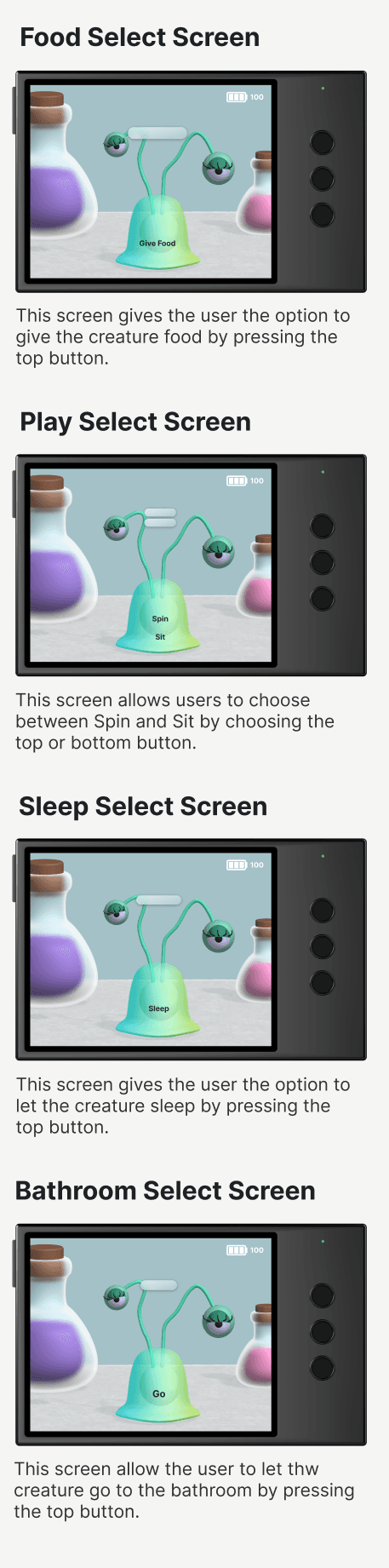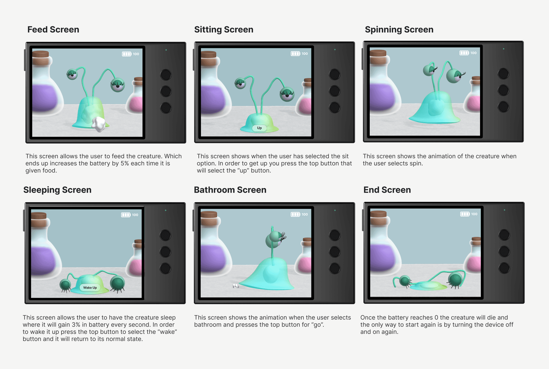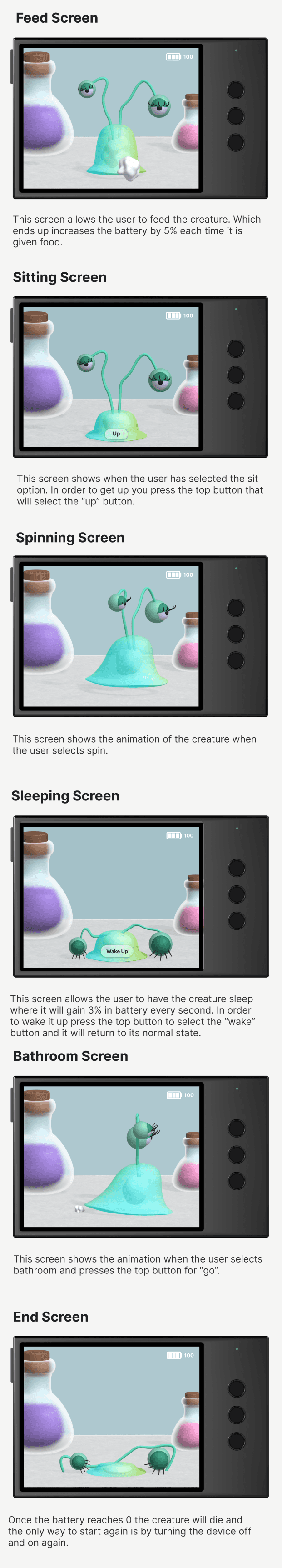 For this project, I explored the possibilities of combining Spline and Figma to create a realistic prototype. Using Spline, I designed and animated 3D objects to bring my concept to life, while Figma allowed me to build interactive elements like a working battery that made the prototype feel functional. One of the biggest challenges was managing all the different pieces, from modeling and animating the creature to designing the case and layout for the three button input. Once everything was ready, I brought all the assets into Figma to assemble the final prototype. Although the process was time consuming and required problem-solving along the way, it taught me how powerful both tools can be when used together and opened my eyes to new creative possibilities.