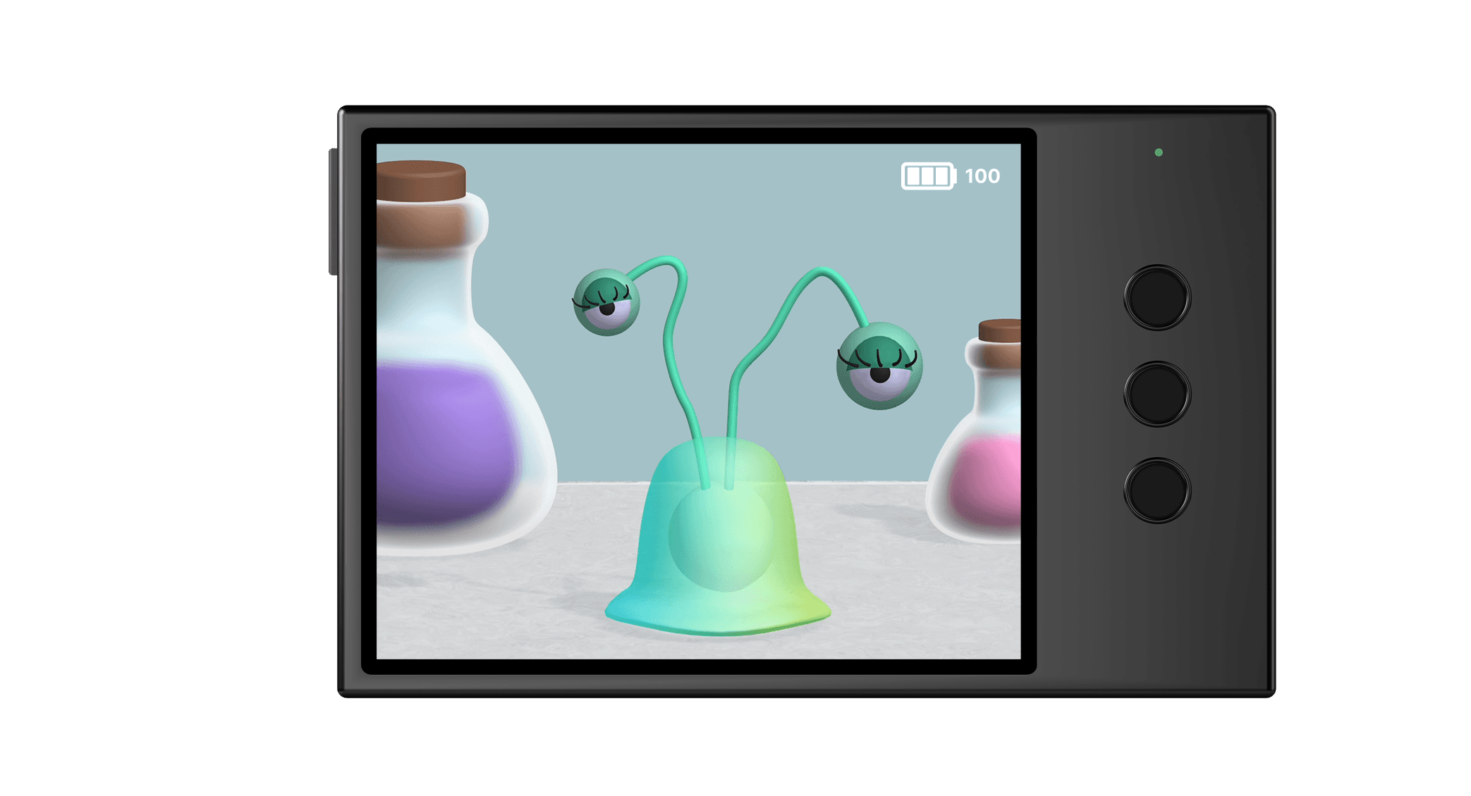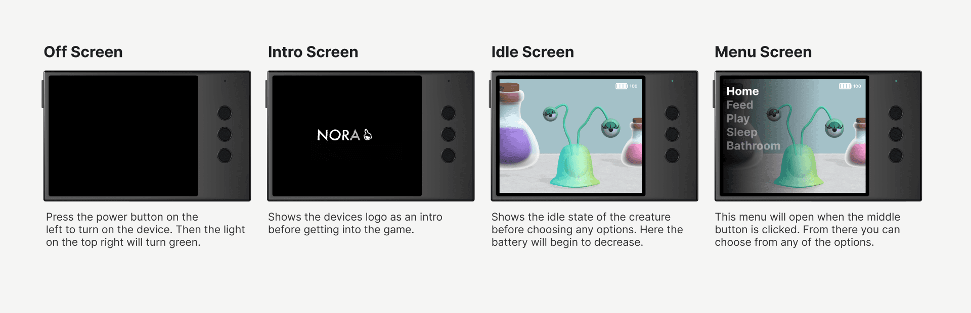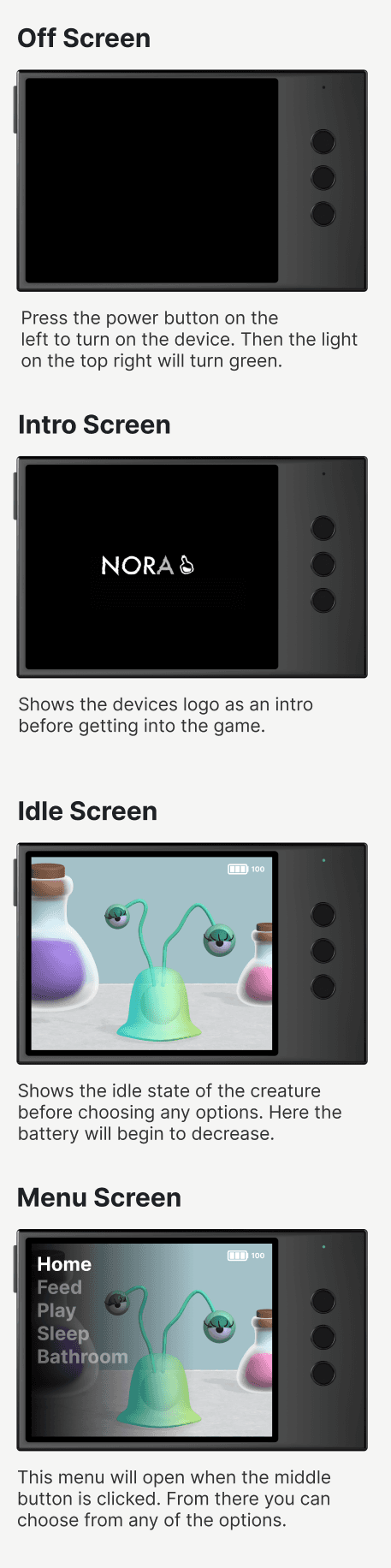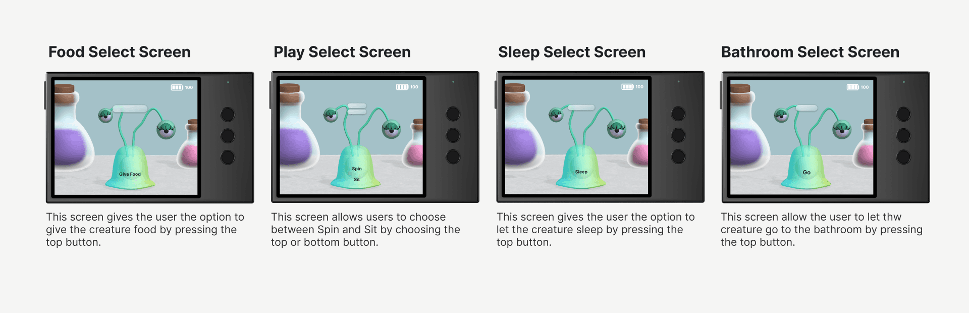 For this project, I explored the possibilities of combining Spline and Figma to create a realistic prototype. Using Spline, I designed and animated 3D objects to bring my concept to life, while Figma allowed me to build interactive elements like a working battery that made the prototype feel functional. One of the biggest challenges was managing all the different pieces, from modeling and animating the creature to designing the case and layout for the three button input. Once everything was ready, I brought all the assets into Figma to assemble the final prototype. Although the process was time consuming and required problem-solving along the way, it taught me how powerful both tools can be when used together and opened my eyes to new creative possibilities.