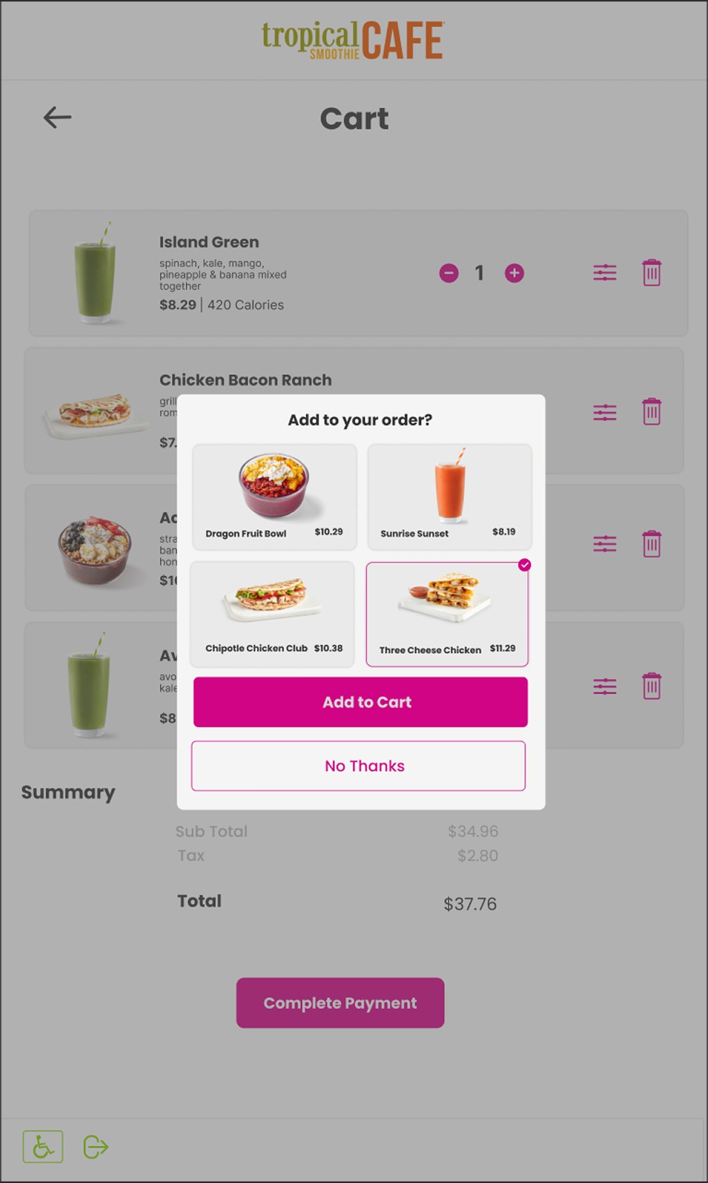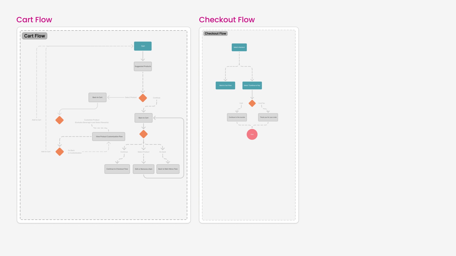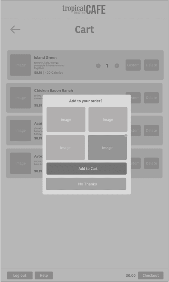 The cart wireframes show the ui for when an item is in the cart and also shows the pop up that will prompt the user to add a select item to their cart or to continue. This engages the user to see more options and allows the opportunity to up sell the customer.