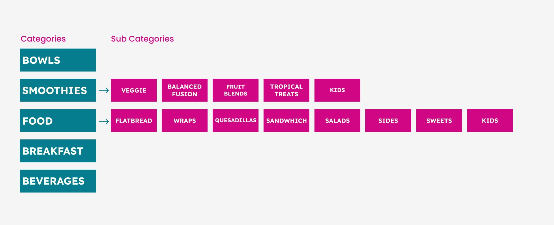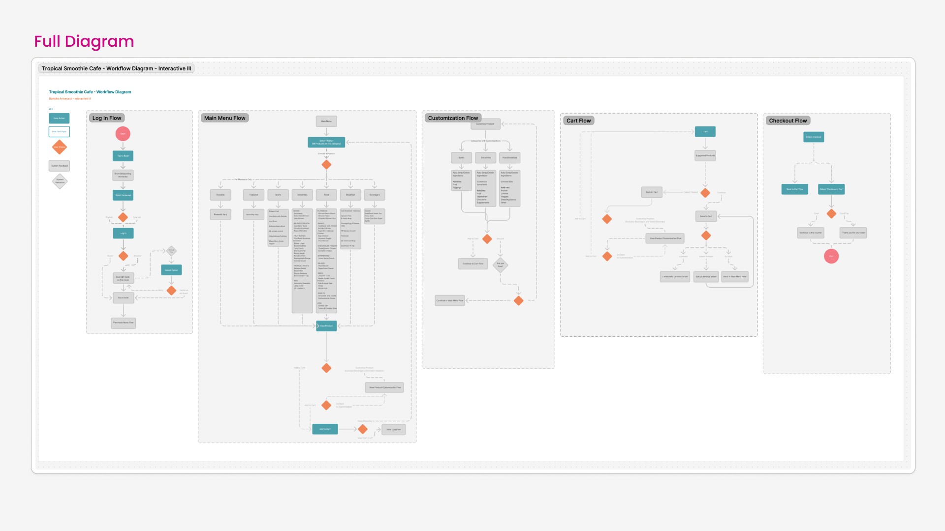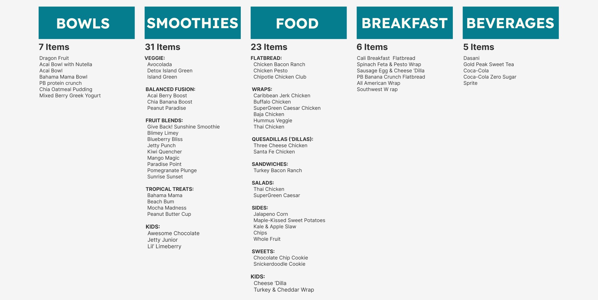 Part of my research included analyizing Tropical Smoothie Cafe's menu and organizing the products to determine total of items and categories that would need to be included.