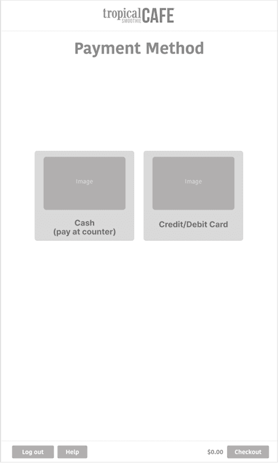 The payment wireframes will lead the user to choose between cash or credit. If cash is chosen they will be prompted to bring their receipt to the register. If credit is selected they will continue to pay at the kiosk.