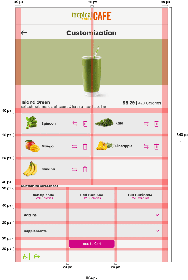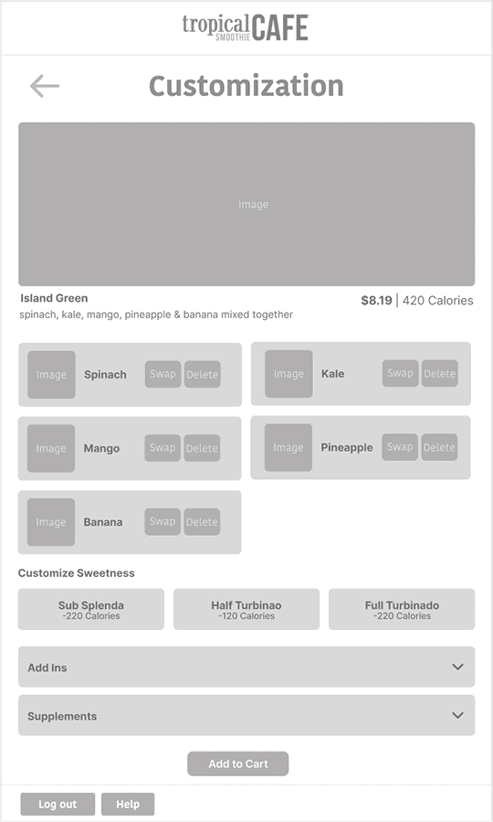 These wireframes show how the user will select a item and add to cart. Once added they will be prompted to whether they would like to customize their item or not.