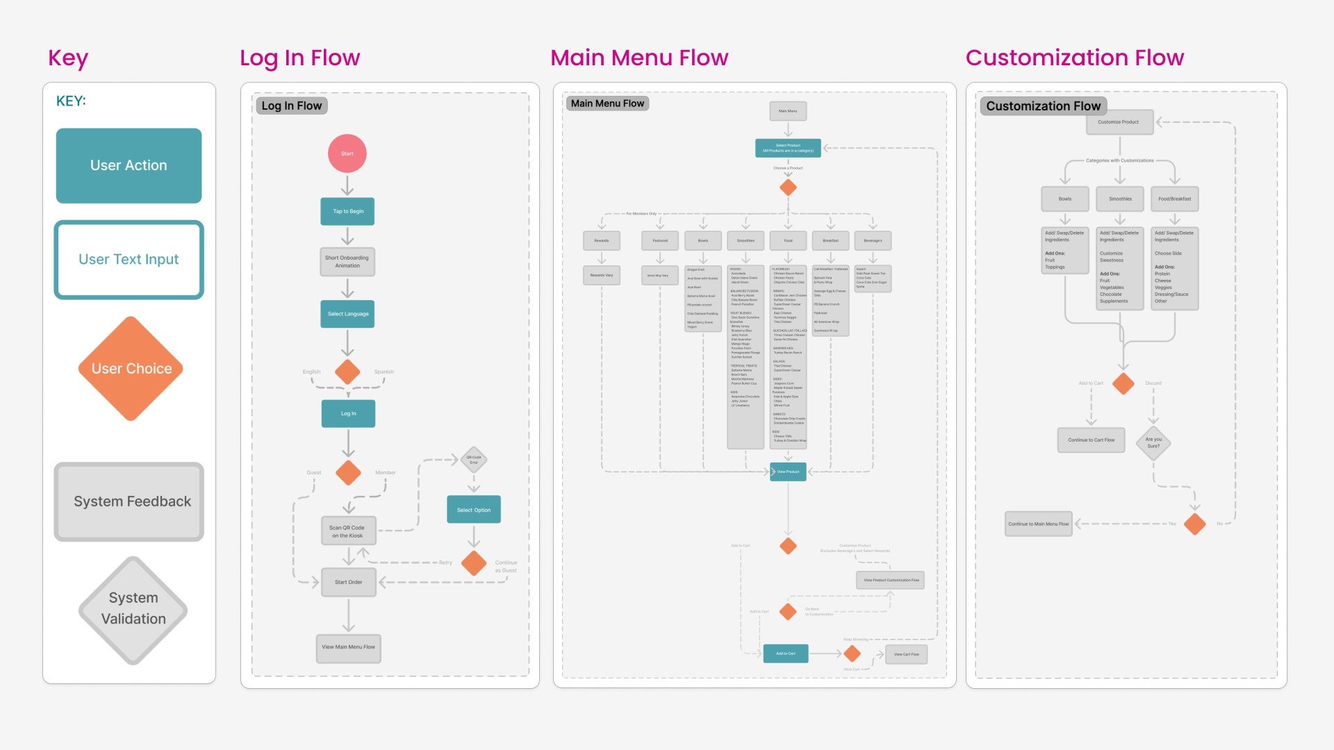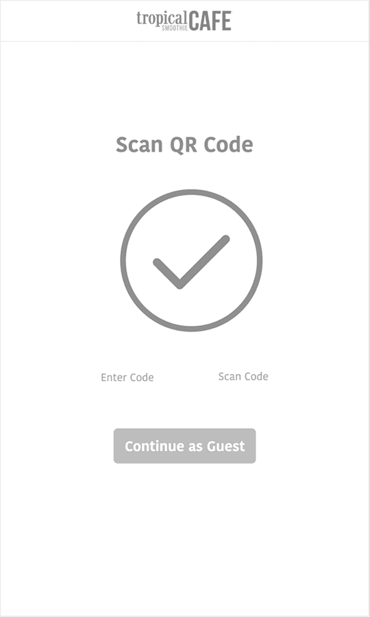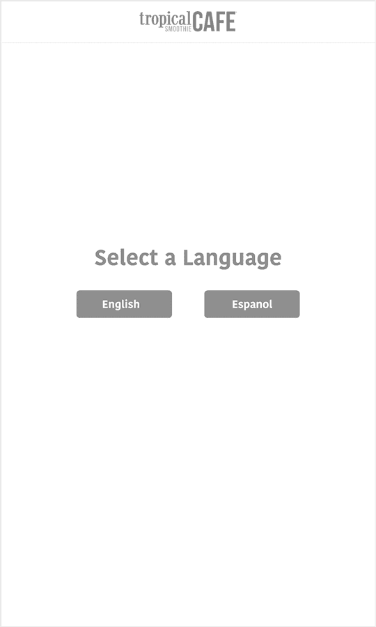 These wireframes represent the idle screen along with onboarding and language selection. Also allowing the user to choose whether to sign in with rewards or continue as a guest.